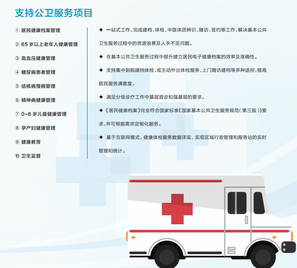 • 《居民健康檔案》完全符合國(guó)家標(biāo)準(zhǔn)《國(guó)家基本公共衛(wèi)生服務(wù)規(guī)范(第三版)》要求,并可根據(jù)需求定制化服務(wù)。